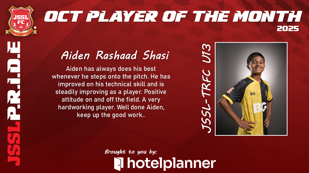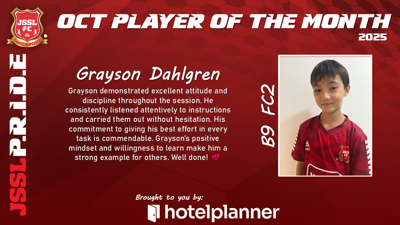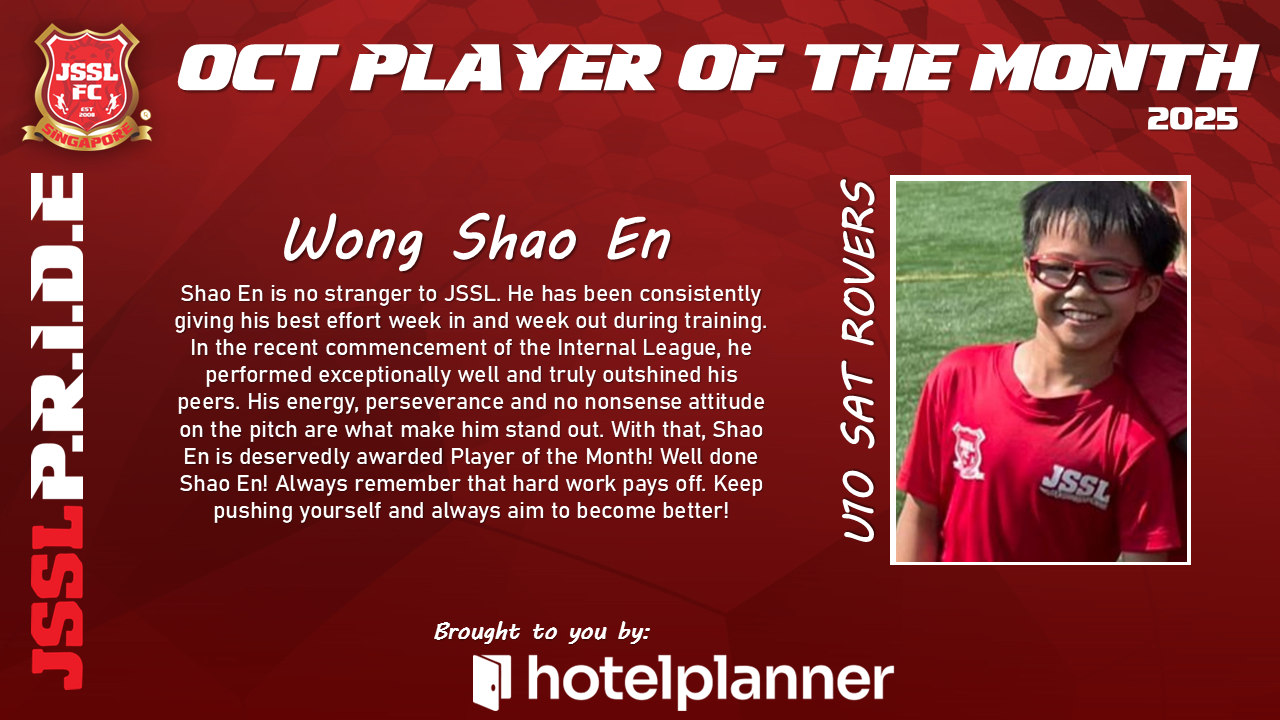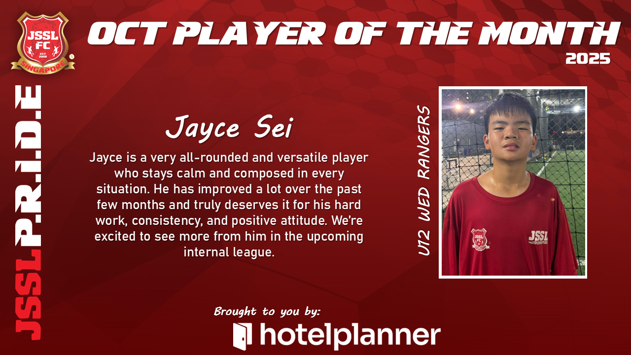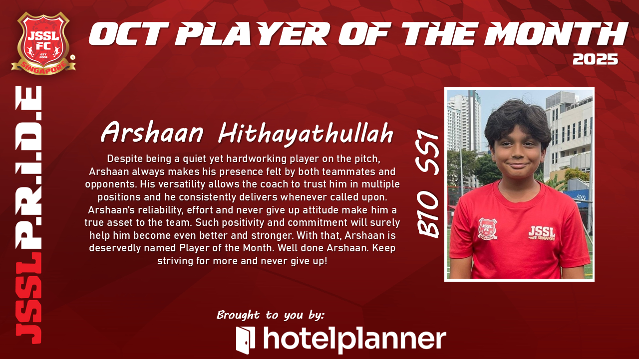 Each month, we recognize players who embody outstanding commitment on the pitch, whilst living out JSSL's P.R.I.D.E values. This award celebrates leaders who inspire others both on and off the field, representing the true spirit of the JSSL family. Their performances showcase all aspects of our JSSL P.R.I.D.E. values. For the new season we are selecting our JSSL Player of the month from each age group and not from each team.