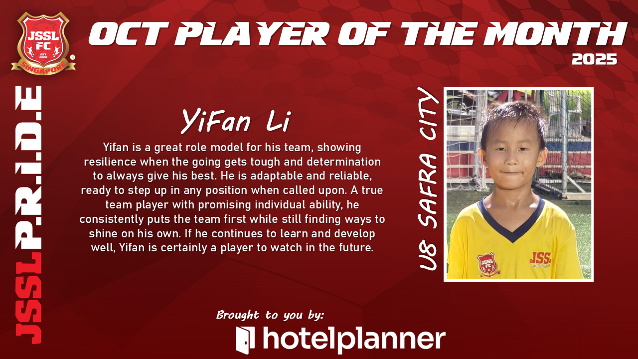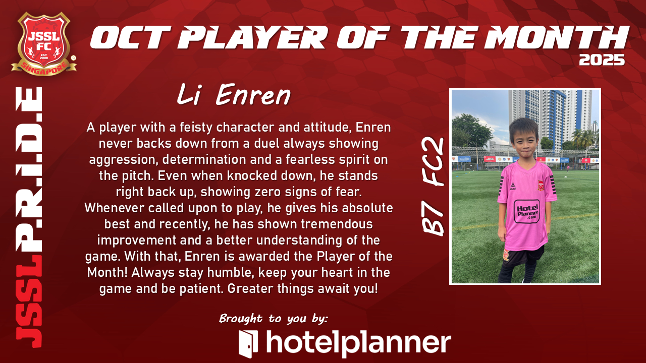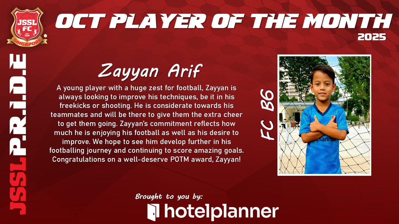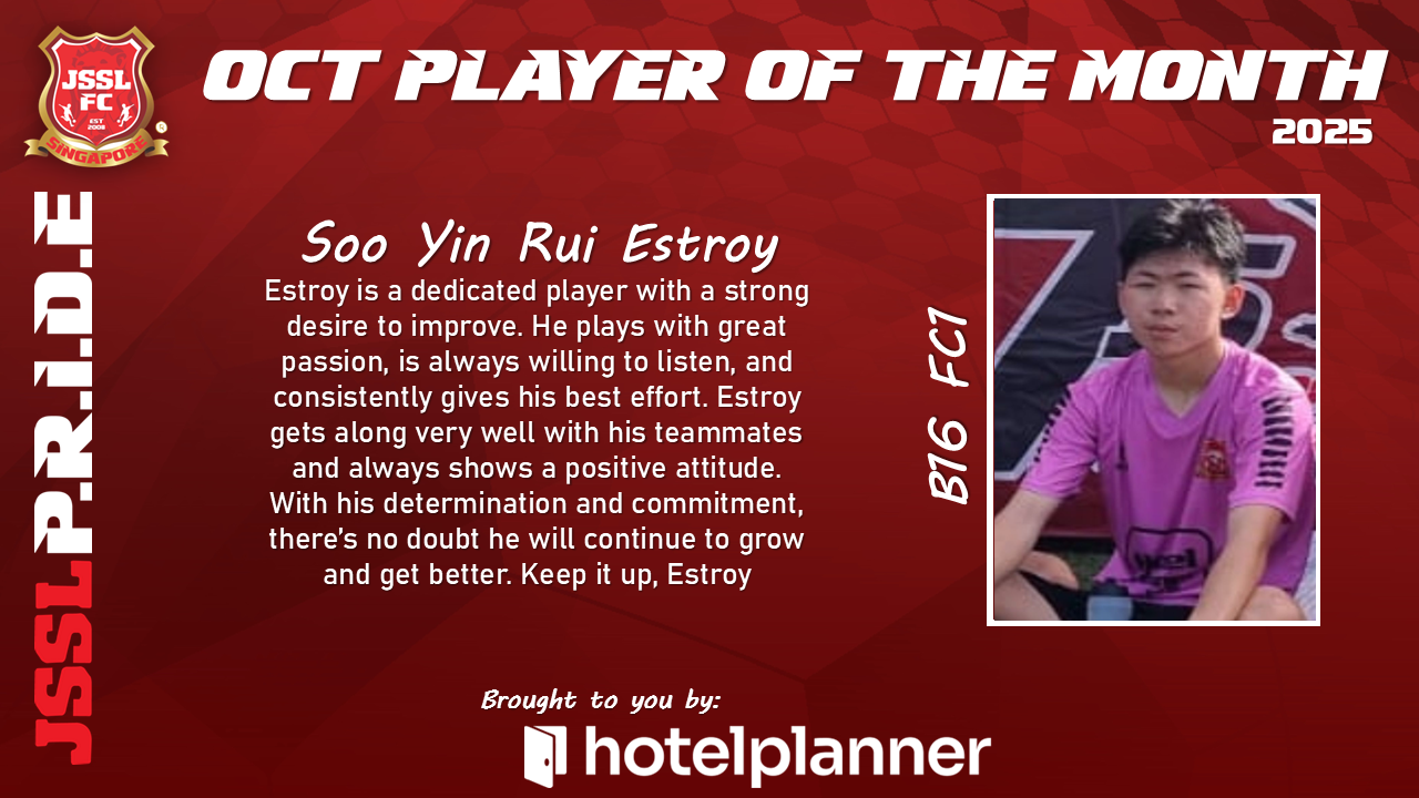 Each month, we recognize players who embody outstanding commitment on the pitch, whilst living out JSSL's P.R.I.D.E values. This award celebrates leaders who inspire others both on and off the field, representing the true spirit of the JSSL family. Their performances showcase all aspects of our JSSL P.R.I.D.E. values. For the new season we are selecting our JSSL Player of the month from each age group and not from each team.